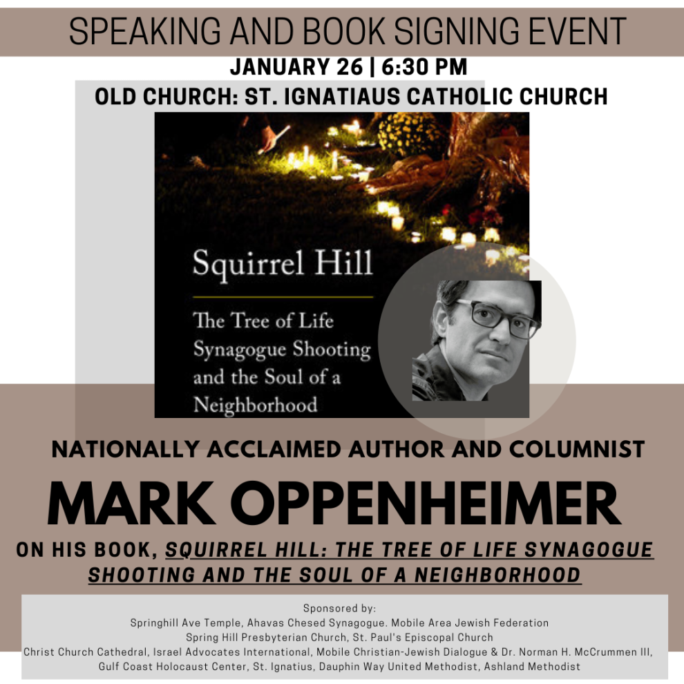Join us as we welcome Mark Oppenheimer to speak about his book, Squirrel Hill: The Tree of Life Synagogue Shooting and the Soul of a Neighborhood. In the shadow of the Tree of Life Synagogue, the Mobile Interfaith community came together to be a light in the darkness of the tragedy. Our community is again coming together to sponsor this event to shine a light on the power and strength of our faith communities working together towards peace and understanding.
